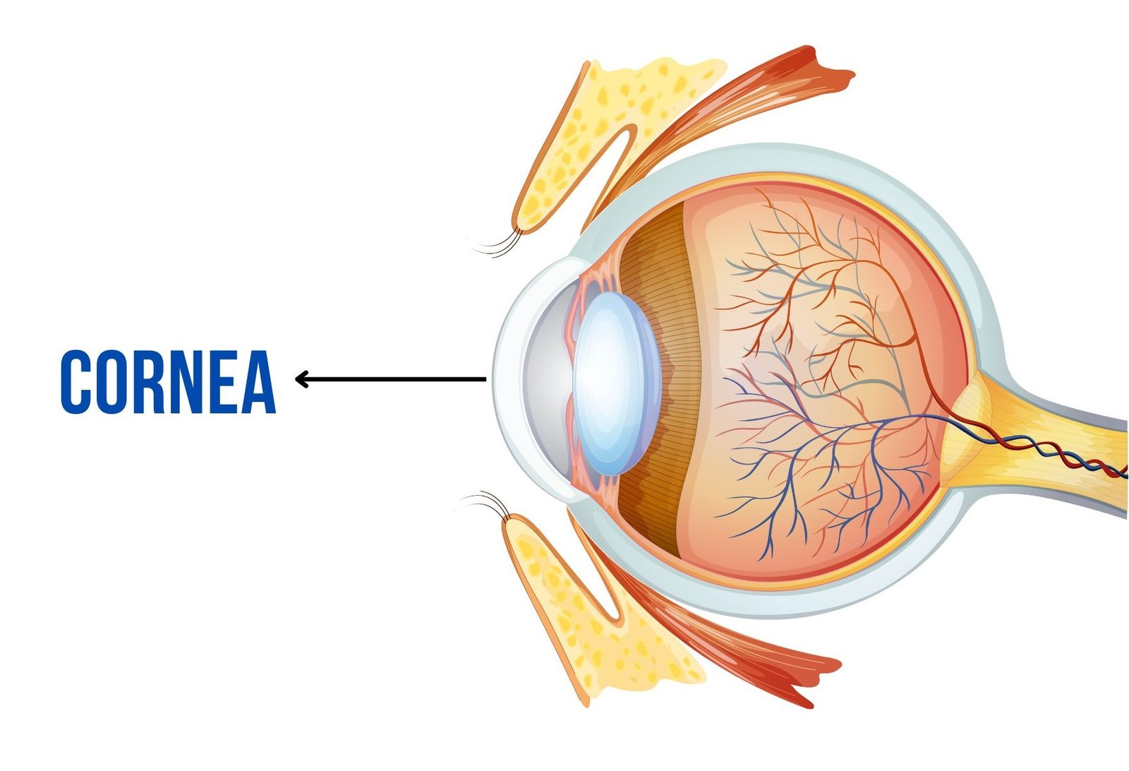 The cornea is the clear front part of the eye, covering the pupil and iris. It provides two-thirds of the eye’s focusing power but remains fixed, while the lens fine-tunes focus. Made up of five to six layers, it stays transparent without blood vessels, getting oxygen from the air through the tear film.